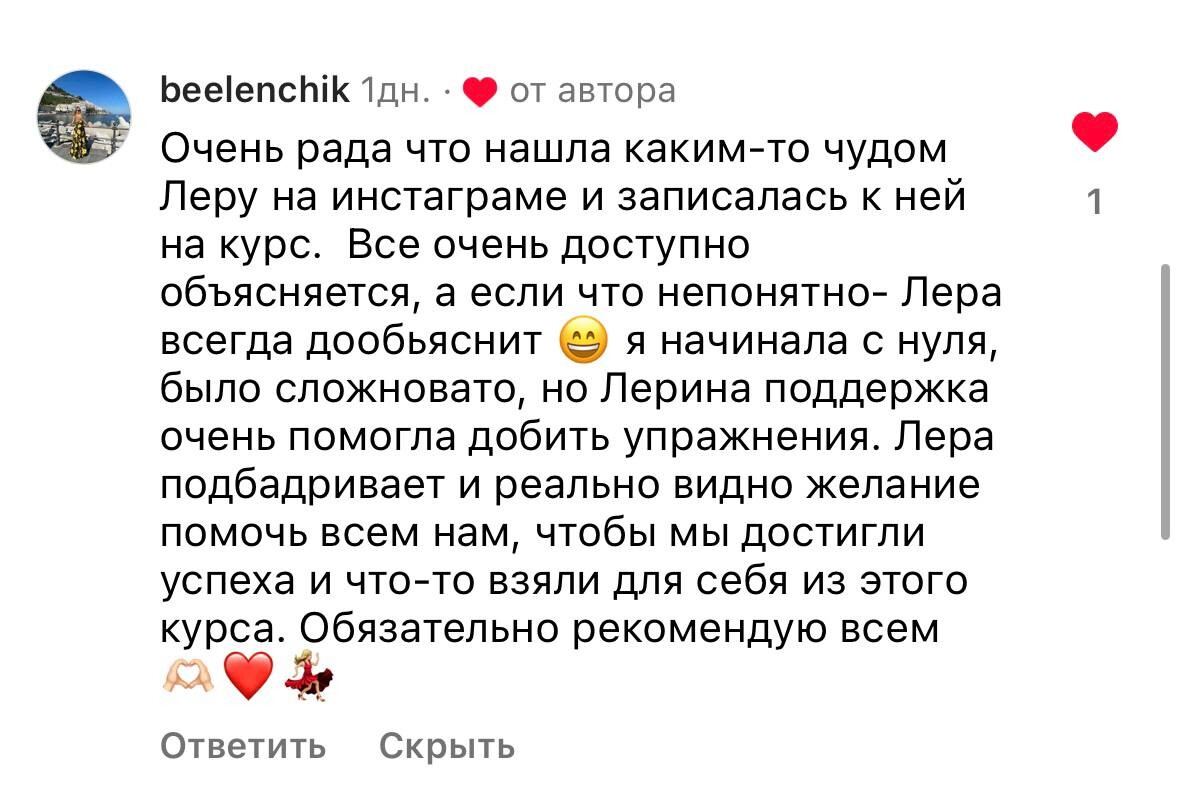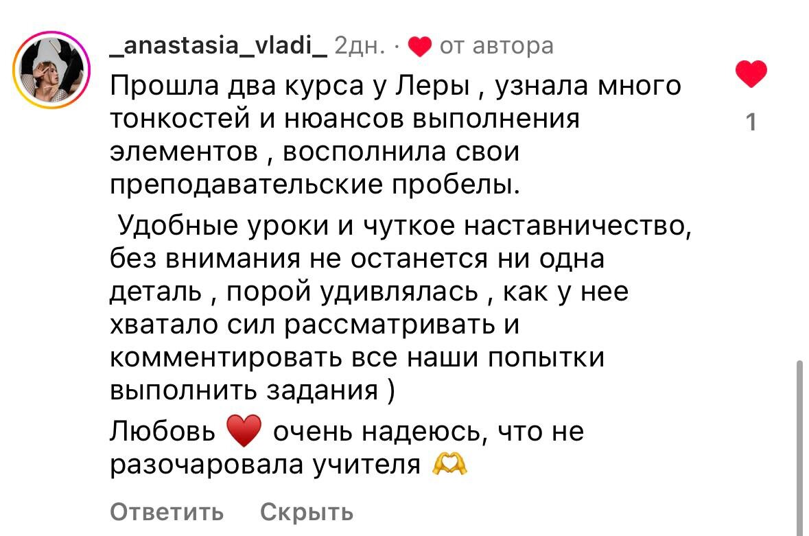 Обучение поможет хорошо понять технику и как исправлять ошибки учеников: в Чате Разборов Лера будет каждому давать обратную связь, где ты сможешь узнать все секреты тренерской работы!